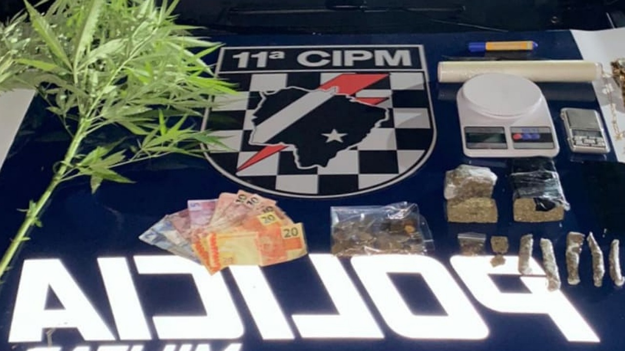 A equipe tática apreendeu o entorpecente e, na residência do suspeito, encontrou outros pedaços pequenos de maconha dentro de uma caixa de papelão, uma balança para pesar grande quantidade, um rolo de plástico filme, uma faca e o total de R$111,35 em cédulas trocadas de pequeno valor e moedas. No quintal, foram localizados dois pés de maconha.