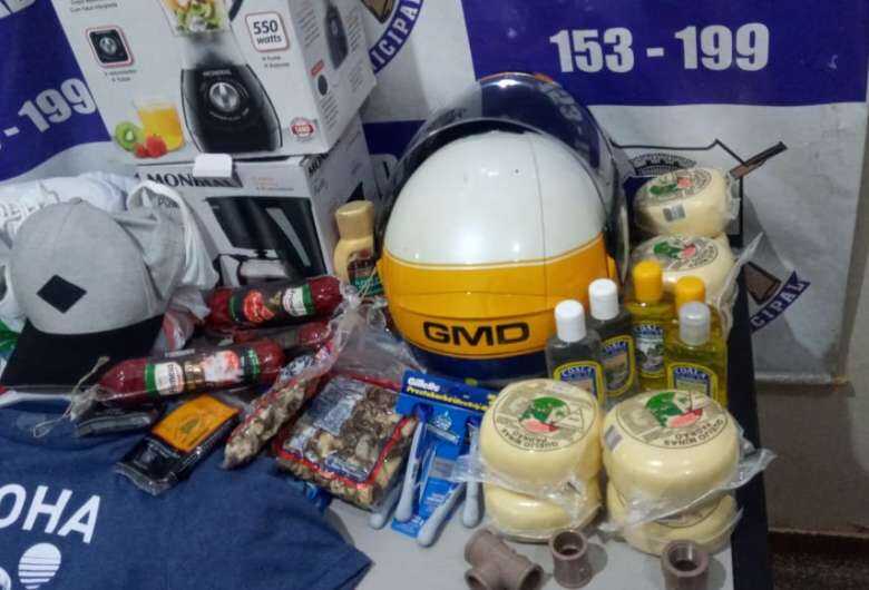Ao ser abordado pela Guarda, foi encontrado com ele um liquidificador, cafeteira, camiseta, boné, creme, cotonete, barbeador, condicionador, salame, queijos, entre outros produtos. O suspeito foi autuado em flagrante pelo furto.
