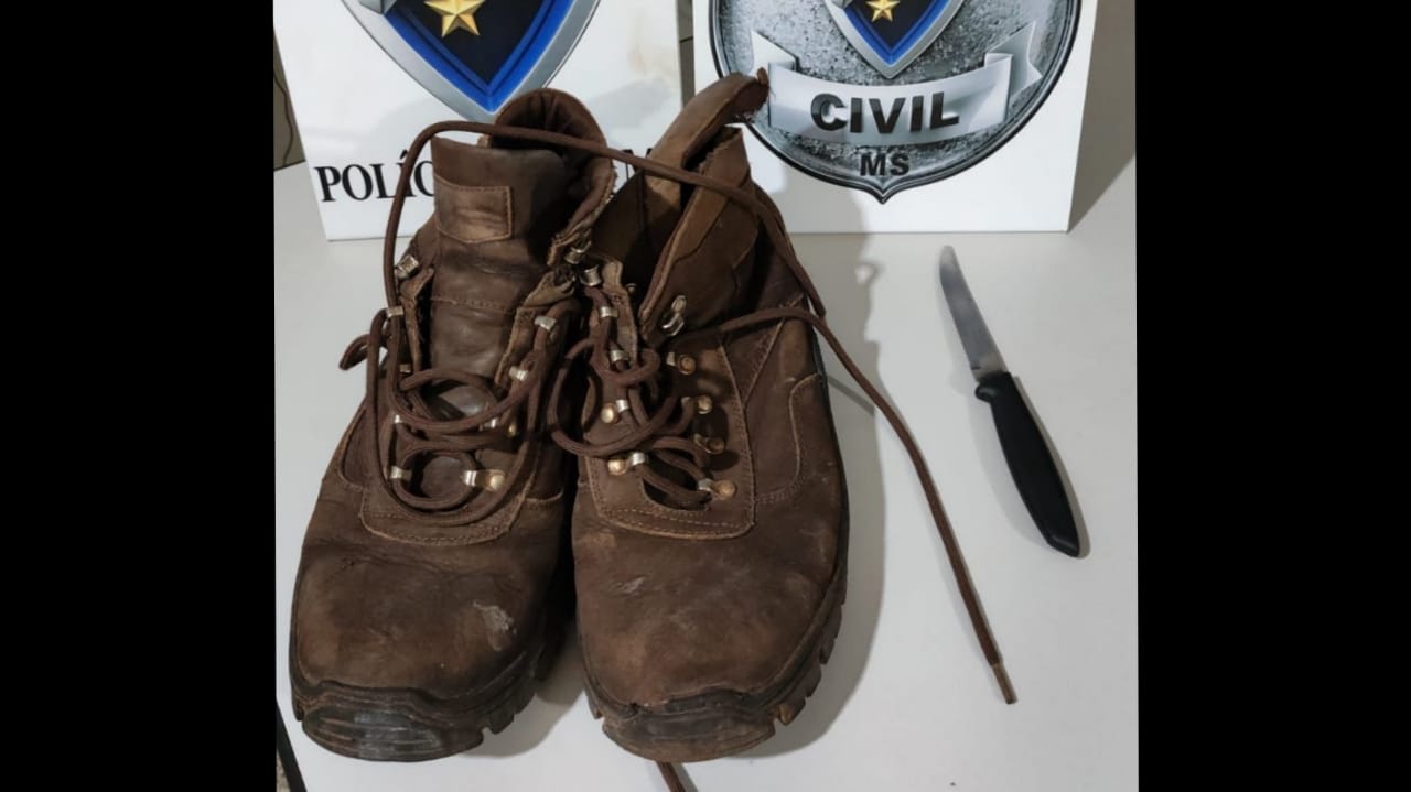 Calçado usado no dia do crime e a faca usada para agredir a vítima (Divulgação/PCMS)