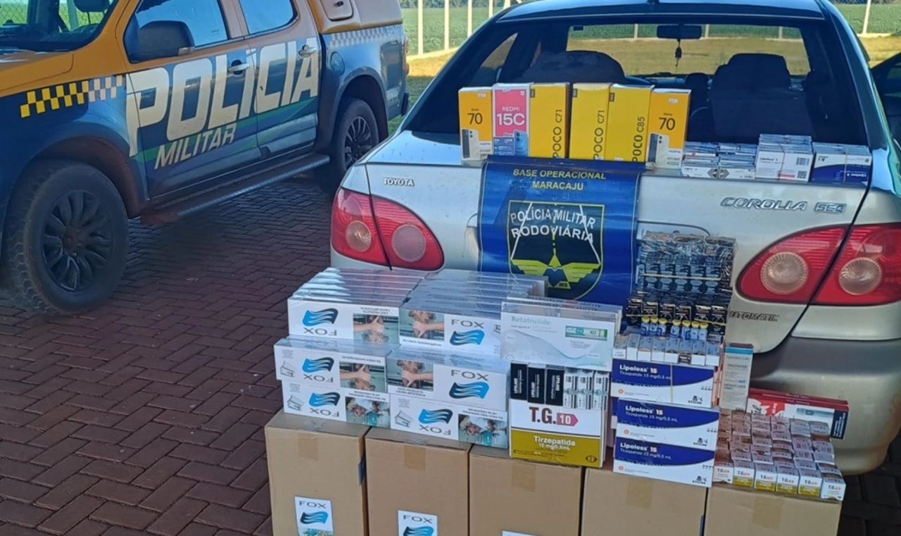 Os produtos, 6 aparelhos de celular Android, 300 pacotes de cigarro, marca Fox, 70 ampolas de testosterona e 141 caixas de medicamentos injetáveis, estavam em um Toyota Corolla.