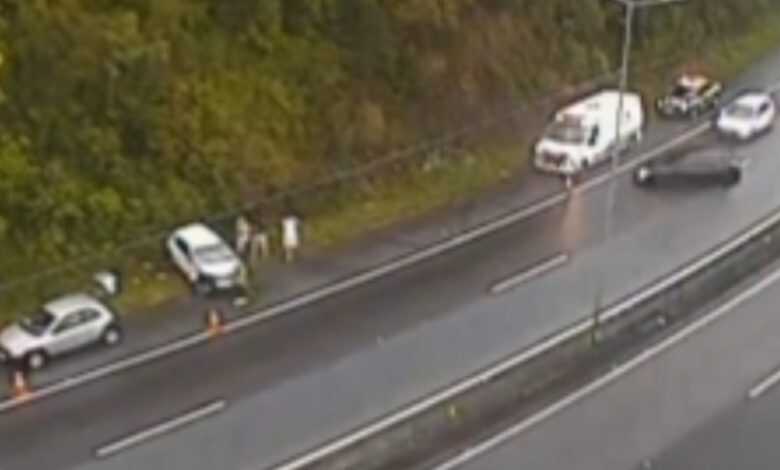 Imagens de câmeras de monitoramento da concessionária Arteris Litoral Sul registraram o momento em que o motorista perde o controle do veículo antes do atropelamento.