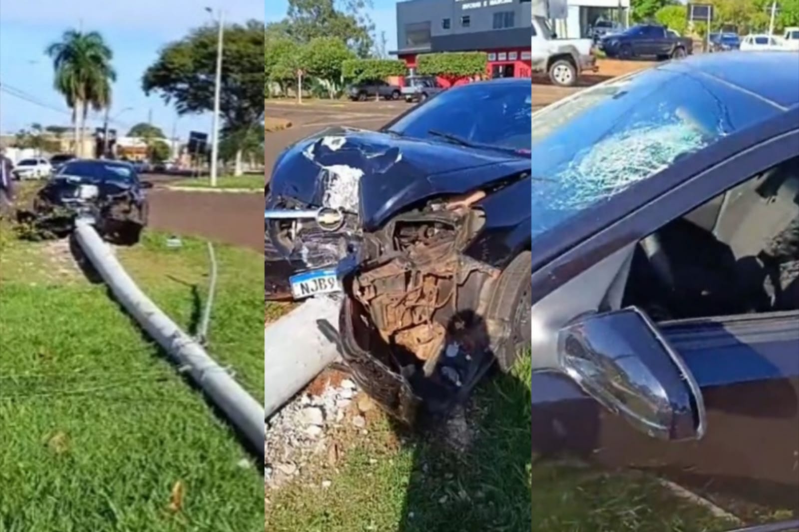 Por conta da violenta colisão, o poste foi derrubado e o carro ficou com a frente completamente destruída.