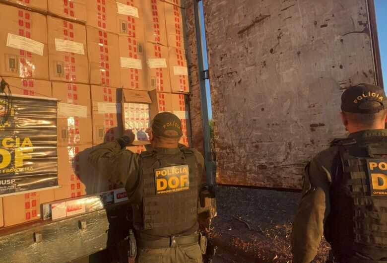 O condutor de um caminhão Mercedes-Benz L 1620, de cor branca, foi preso em flagrante ao ser pego transportando mais de 35 mil pacotes de cigarros de origem estrangeira e comercialização ilegal no Brasil.