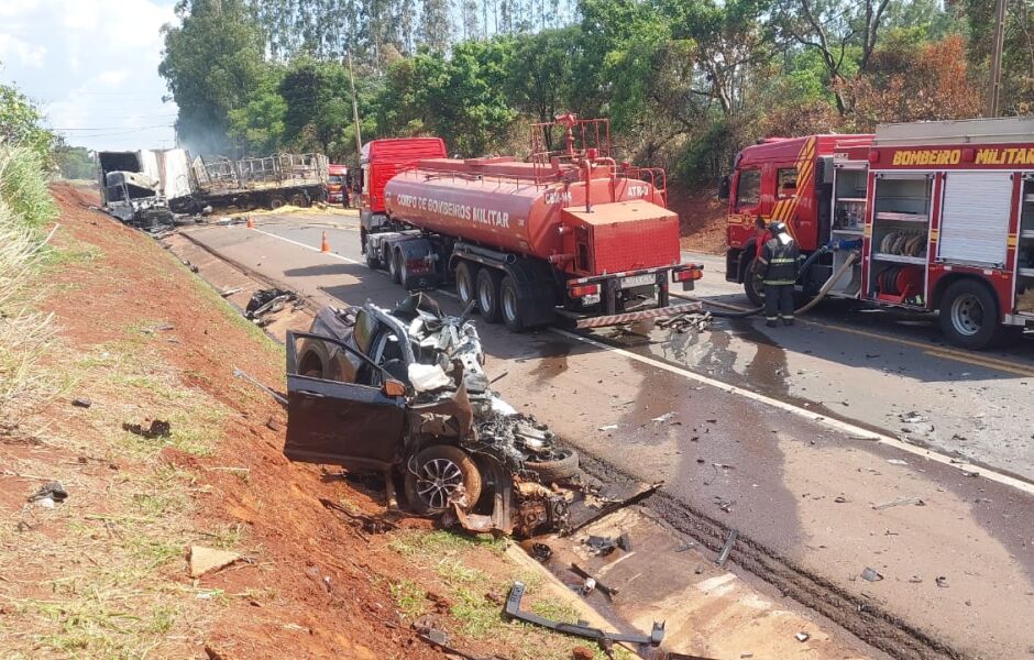 Os três veículos ficaram completamente destruídos com a colisão. As duas faixas da BR-163 foram interditadas para que as equipes da PRF (Polícia Rodoviária Federal), Corpo de Bombeiros, CCR MSVia, Perícia e Polícia Civil trabalhem no local.