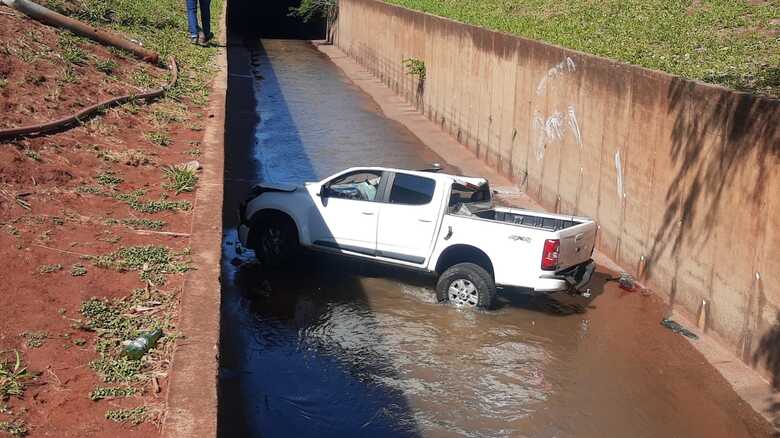 Os campo-grandenses que passavam pela Avenida Ernesto Geisel, próximo a rotatória da Av. Rachid Neder, em Campo Grande, na manhã deste domingo (10) se assustaram ao ver uma caminhonete S-10, caída no córrego.