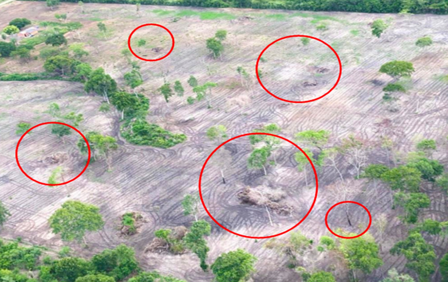A propriedade foi embargada, e o proprietário foi notificado a apresentar documentação como matrícula no Cadastro Ambiental Rural (CAR), Programa de Regularização Ambiental (PRA), Plano de Recuperação de Áreas Degradadas ou Alteradas (Prada) e licenças ambientais. Ele também deve informar interesse em firmar um Termo de Ajustamento de Conduta (TAC).