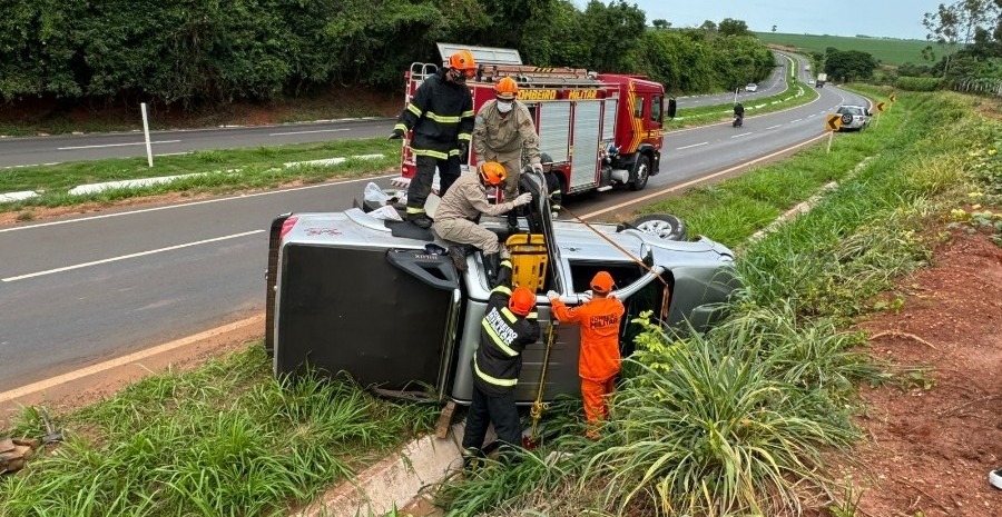 Por conta disso, ele perdeu o controle de direção e saiu da pista, capotando várias vezes. O motorista e um passageiro tiveram apenas estado de choque. Já uma mulher, que estava no banco traseiro, ficou presa às ferragens.
