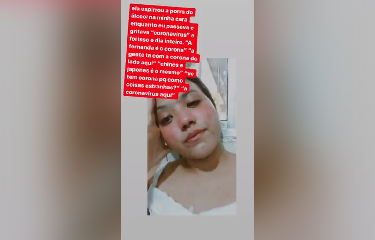 Fernanda Yumi Tagashira, 19 anos, recebeu uma borrifada de álcool de uma colega de trabalho, na terça (17), em São Paulo. Por possuir traços orientais a vítima também foi chamada de “coronavírus” dentro do ambiente de trabalho.