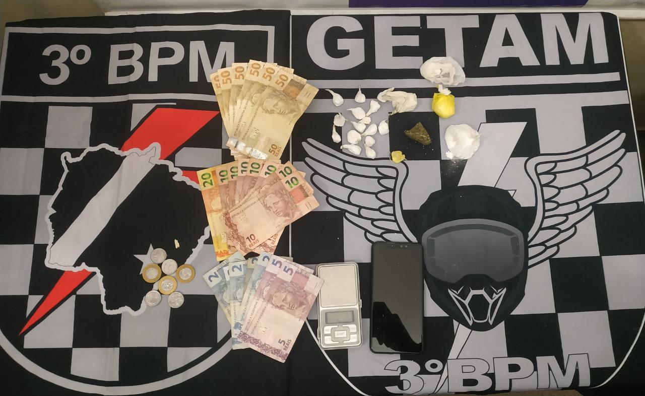 Os Policiais Militares do Grupamento Tático Motorizado, GETAM prenderam Vando de Andrade Santos, de 27 anos, após ser flagrado de posse de várias trouxinhas de pasta base e cocaína, na tarde dessa segunda-feira (29).
