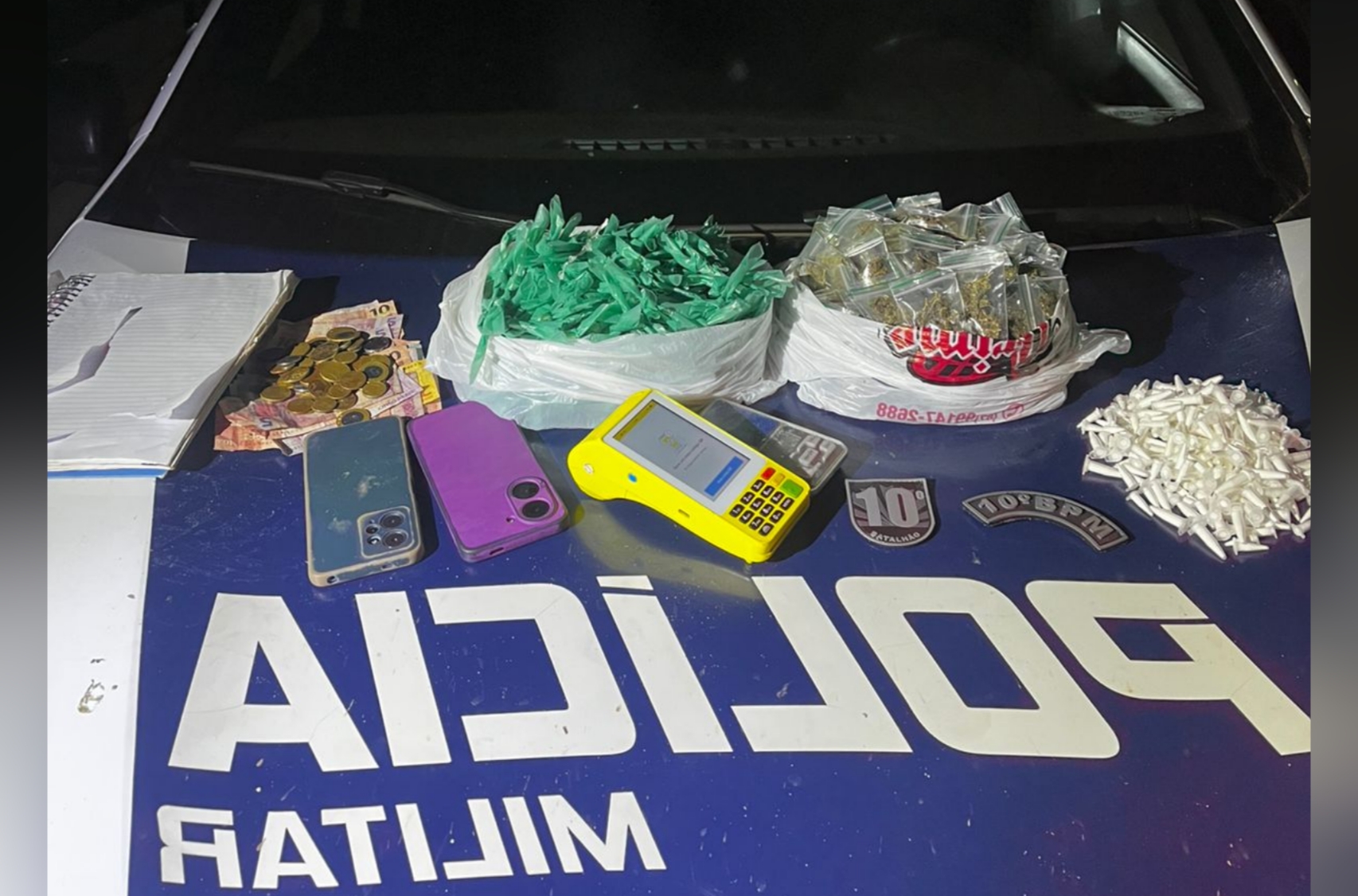 Questionados sobre os entorpecentes, os indivíduos informaram que pertenciam a um rapaz, o qual teria corrido para o fundo da casa e pulado o muro. Diante do flagrante, também foi localizada, no mesmo cômodo, uma quantia em dinheiro que totalizava R$ 300,05 (trezentos reais e cinco centavos), em cédulas e moedas, bem como dois celulares, uma máquina de cartão e uma balança de precisão com vestígios de um pó branco, aparentemente substância análoga à cocaína.