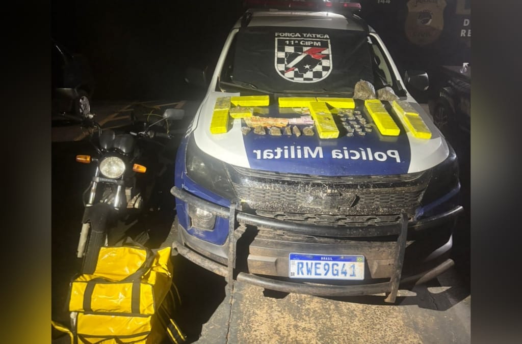 Na bag do motoqueiro, os militares encontraram dois tabletes de maconha e mais sete porções da droga. Em conversa com os policiais, ele afirmou estar devendo para traficantes e passou a atuar no esquema de “disk-drogas”, organizado por telefone. Também relatou que havia pegado a droga em um mercado localizado no bairro Jardim Centro Oeste.