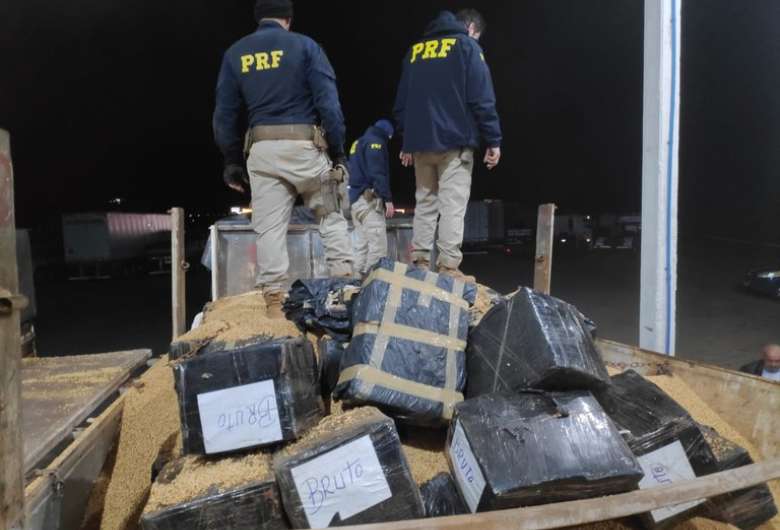 O entorpecente foi localizado sob carga de soja em dois semirreboques, atrelados ao caminhão M. Benz Axor, de placas de Itaipulândia (PR), conduzido por um homem.