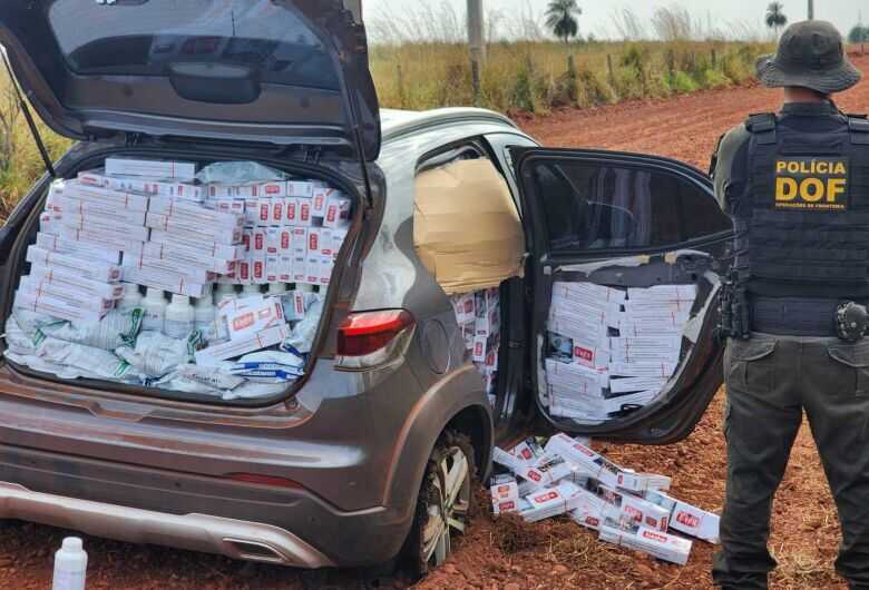 Buscas foram feitas na região, mas nenhum suspeito localizado. No interior do veículo foram encontrados 1.600 pacotes de cigarros contrabandeados do Paraguai, além de 107 litros defensivos agrícolas em galões e 79 quilos do mesmo material em sacos.