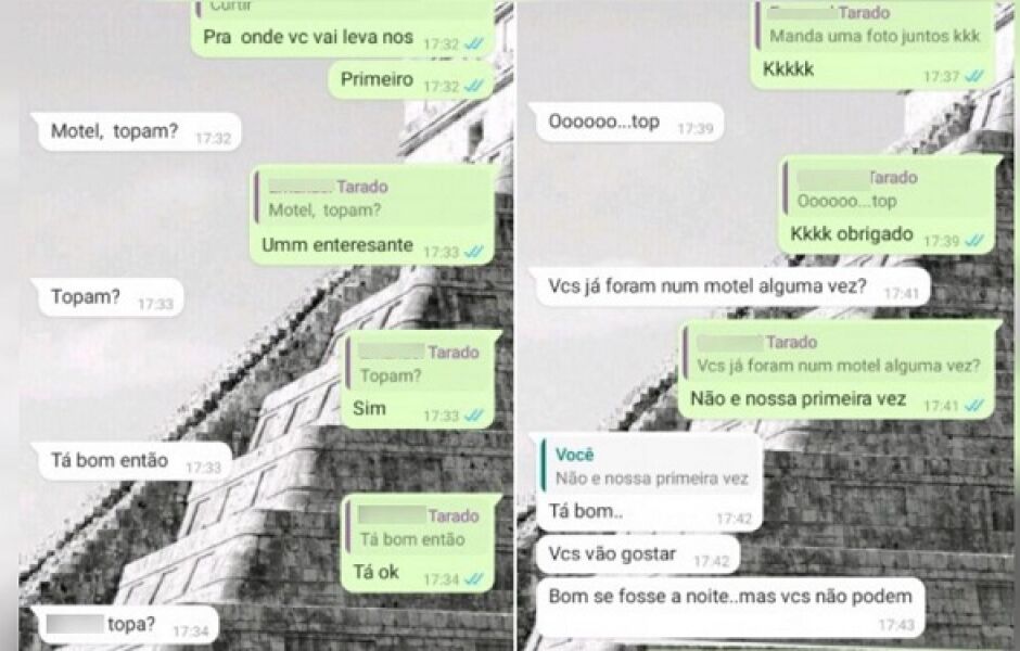 Após isso, o jovem e o policial passaram a trocar mensagens por meio de um aplicativo. Prints mostram que o suspeito dizia que levaria o rapaz e o adolescente ao motel e que eles iriam “gostar”. O militar chegou a pedir foto ao jovem junto com a vítima e questionava se o adolescente também toparia ir ao motel.