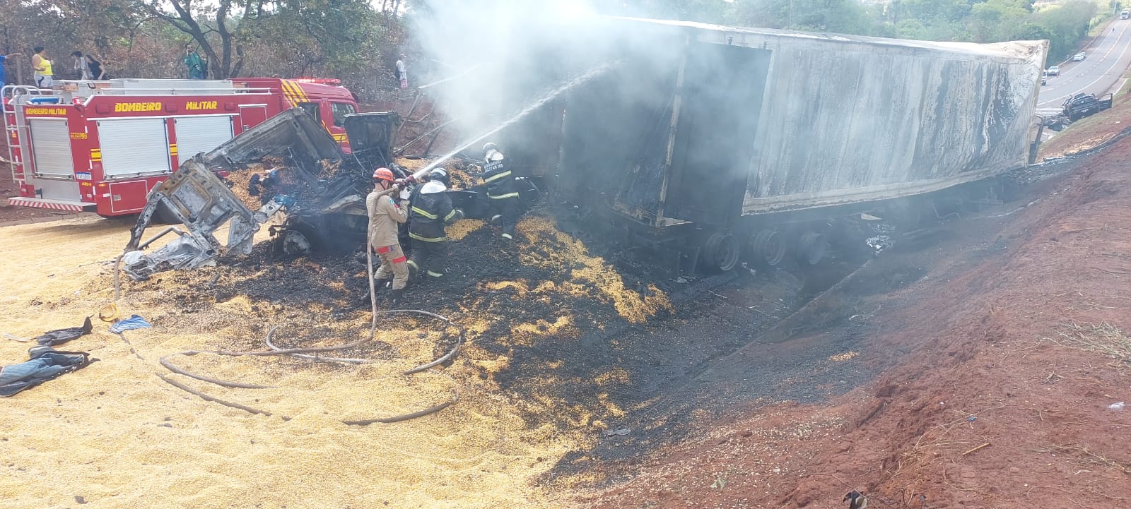 O acidente – Ontem, o motorista de uma Fiat Toro, que estava acompanhado de uma mulher, identificada como Cristiele e um menino, de 12 anos, tentou realizar uma ultrapassagem e acabou colidindo frontalmente contra um caminhão que seguia na direção contrária. Ainda como resultado, o veículo longo atingiu um segundo caminhão, o que ocasionou nas chamas nos dois veículos.