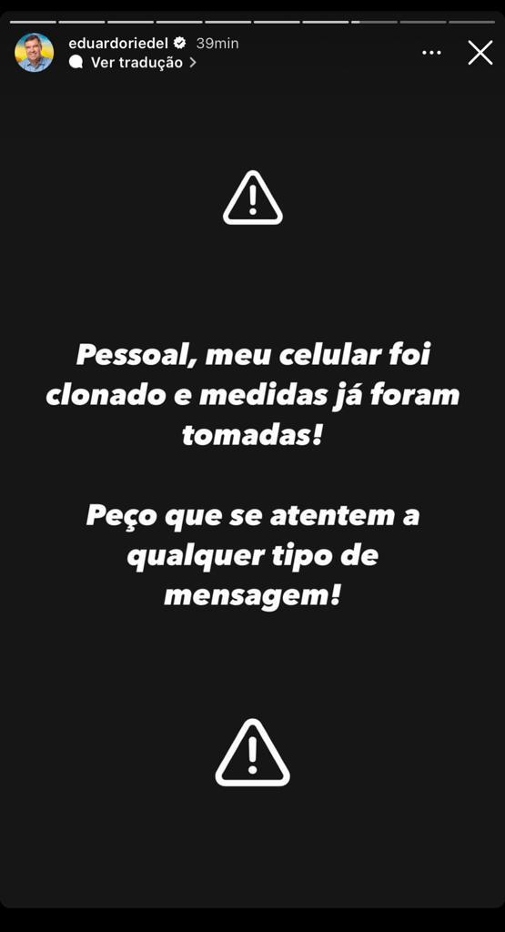 O governador Eduardo Riedel e sua equipe comunicaram que seu número de celular foi clonado, no entanto "as medidas já foram tomadas".