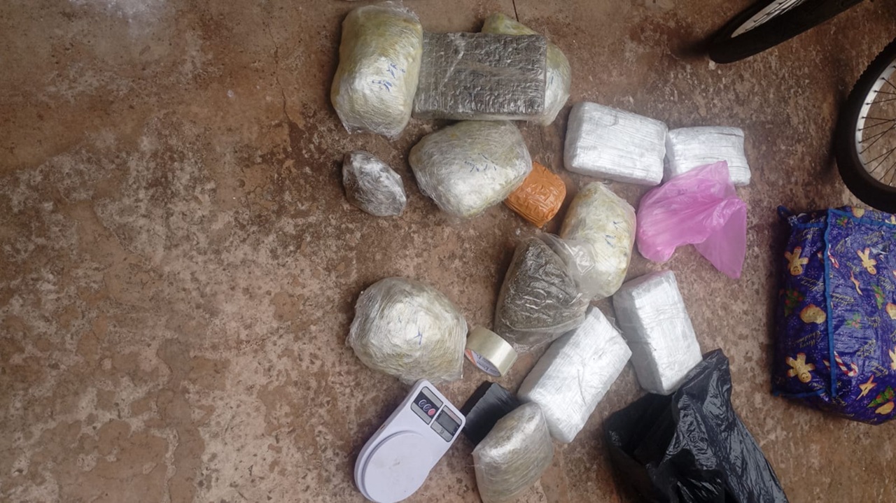 Em razão da ocorrência, a equipe da ROMU conseguiu apreender 12 tabletes de maconha, que totalizaram mais de 7,9 quilos, além de um tablete de cocaína que pesava 336 gramas, um celular, uma prensa e itens para preparação dos entorpecentes.