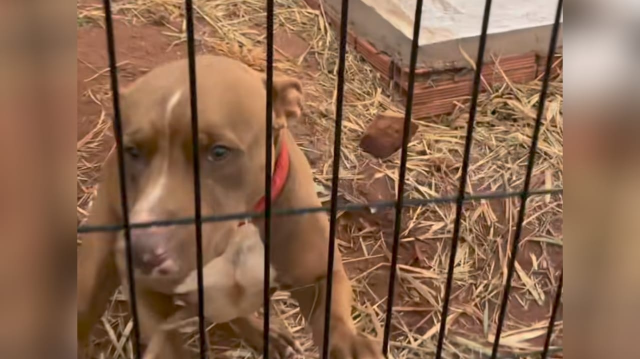 Cachorro, da raça pitbull, foi resgatado de uma chácara pelo Major Everton, de 37 anos, da Polícia Militar durante a noite deste domingo, dia 1º, no Jardim Santa Felicidade, em Campo Grande.