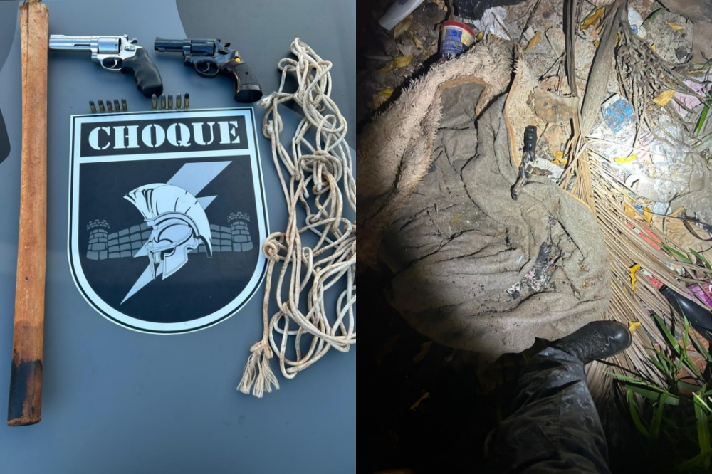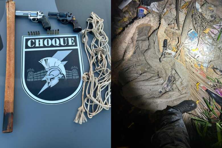 No local, os policiais apreenderam corda, porrete, dois revólveres calibre .38 e 10 munições, além das caminhonetes usadas no crime. Uma das armas foi encontrada sob uma cômoda dentro da casa e a outra escondida na vegetação próxima à Amarok. Um dos envolvidos assumiu a posse de um dos revólveres.