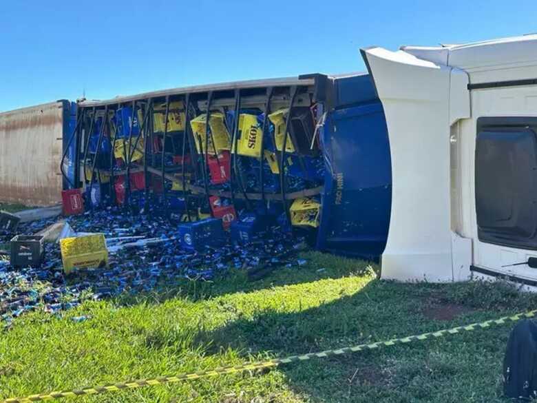 Uma carreta, que estava carregada com cerveja, tombou às margens da BR-163, no trevo de acesso à BR-267, em Nova Alvorada do Sul, na manhã desta sexta-feira (26).