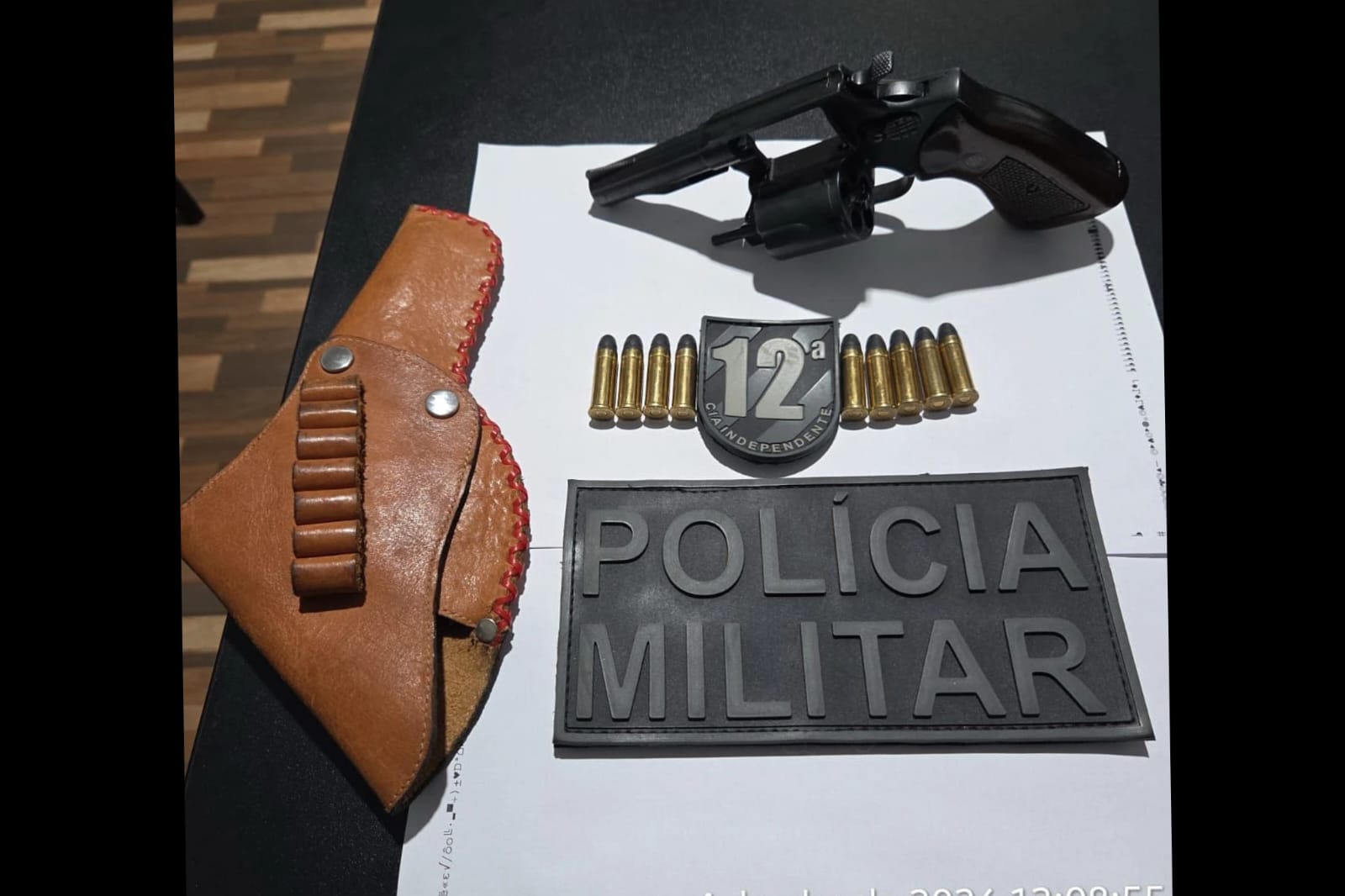 Ainda de acordo com a vítima, ela também foi ameaçada com um revólver. Durante as diligências, os policiais localizaram a arma, um revólver calibre .38 da marca Rossi, na casa de um terceiro, após indicação da esposa dele.