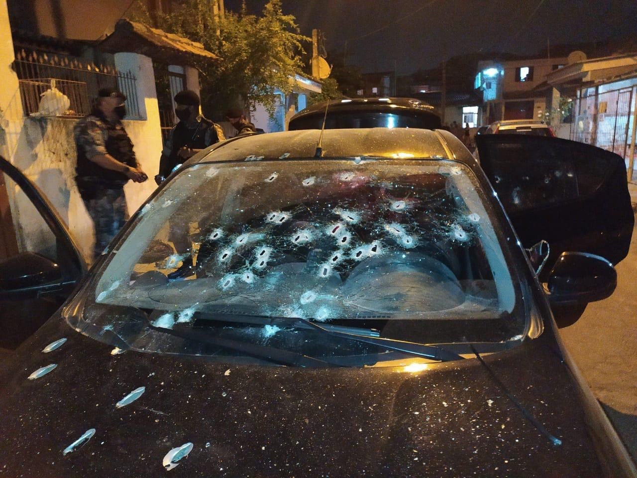 Na ação, o policial ficou ferido, e os dois homens que estavam no carro foram mortos. Dentro do veículo, a BM afirma ter encontrado quatro armas, rádio comunicador e drogas.