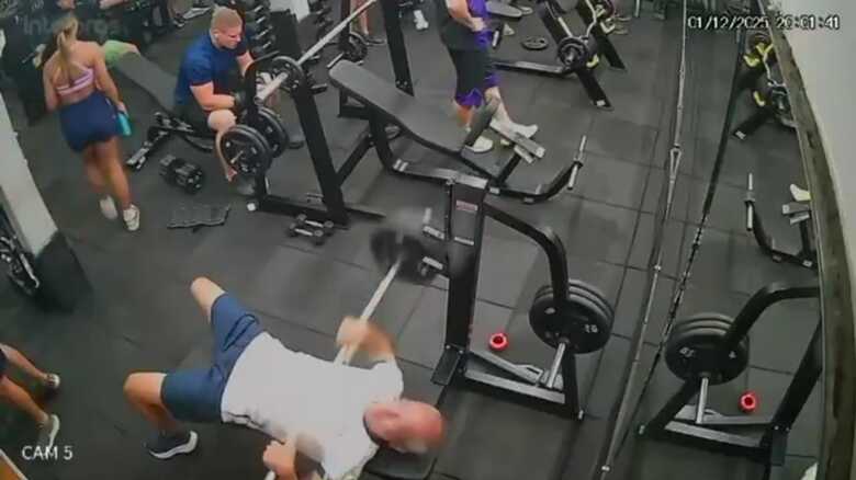 Na imagem registrada pelas câmeras de segurança, é possível ver Ronald José Salvador, de 55 anos, se exercitando, quando a barra escorrega de sua mão e cai sobre seu tórax.