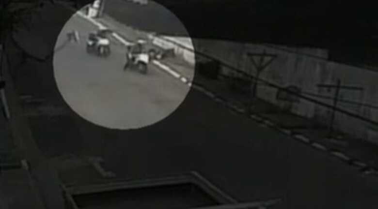 Em seguida é possível ver nas imagens o momento que dois policiais da Rocam (Ronda Ostensiva com Apoio de Motocicletas) cercam Rogério, que reduz a velocidade da moto até parar perto da calçada.