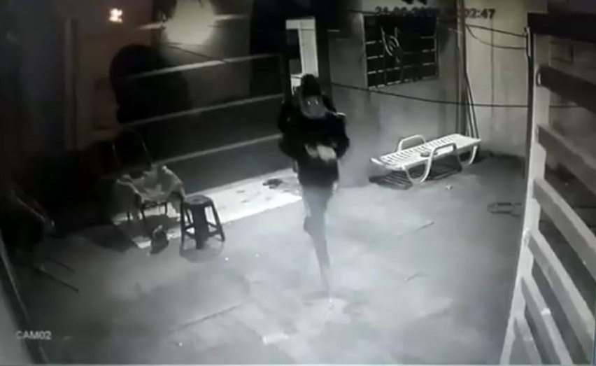 As duas câmeras da frente da casa não estava filmando, mas estava funcionando, de acordo com a técnica de enfermagem, os bandidos arrombaram o portão com o pé, já na dentro do imóvel, dois autores entram e chutam a porta e não conseguem abrir, então vai o terceiro indivíduo correndo bate e arrebenta a porta,