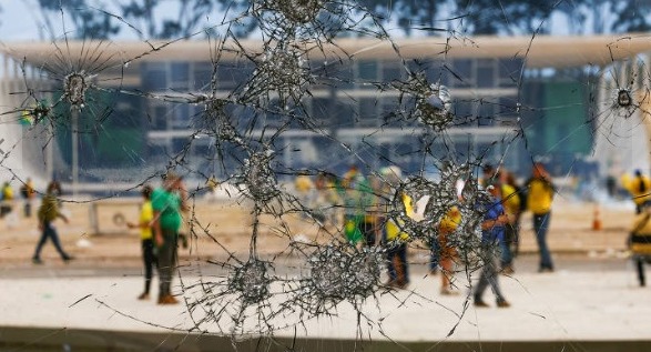 Manifestantes através de vidros quebrados no atentado golpista (Adriano Machado/Reuters)
