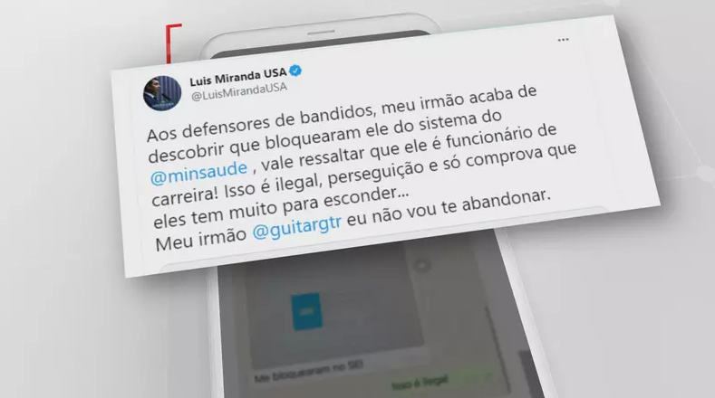 Em sua conta no Twitter, Miranda afirmou o seguinte: "Aos defensores de bandidos, meu irmão acaba de descobrir que bloquearam ele do sistema do @minsaude", citando a conta do Ministério da Saúde na plataforma.