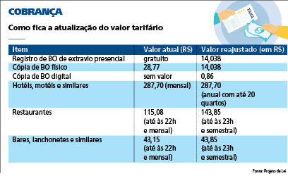 Outro ponto foi em relação ao registro e às cópias de boletins de ocorrência. Foi criada uma tarifa de R$ 14,38 para registrar BO de extravio de documentos e objetos presencialmente.