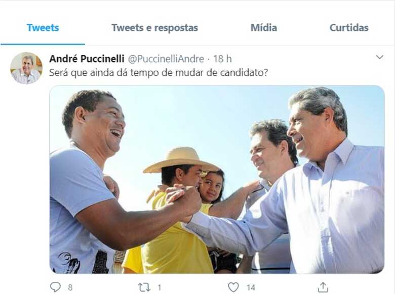 Uma conta em nome do ex-governador, André Puccinelli (MDB) foi invadido por um hacker na última segunda-feira (21). O criminoso teria publicado o seguinte questionamento: “Será que ainda dá tempo de mudar de candidato?” Ao lado do tweet aparece segurando nas mãos de um eleitor.