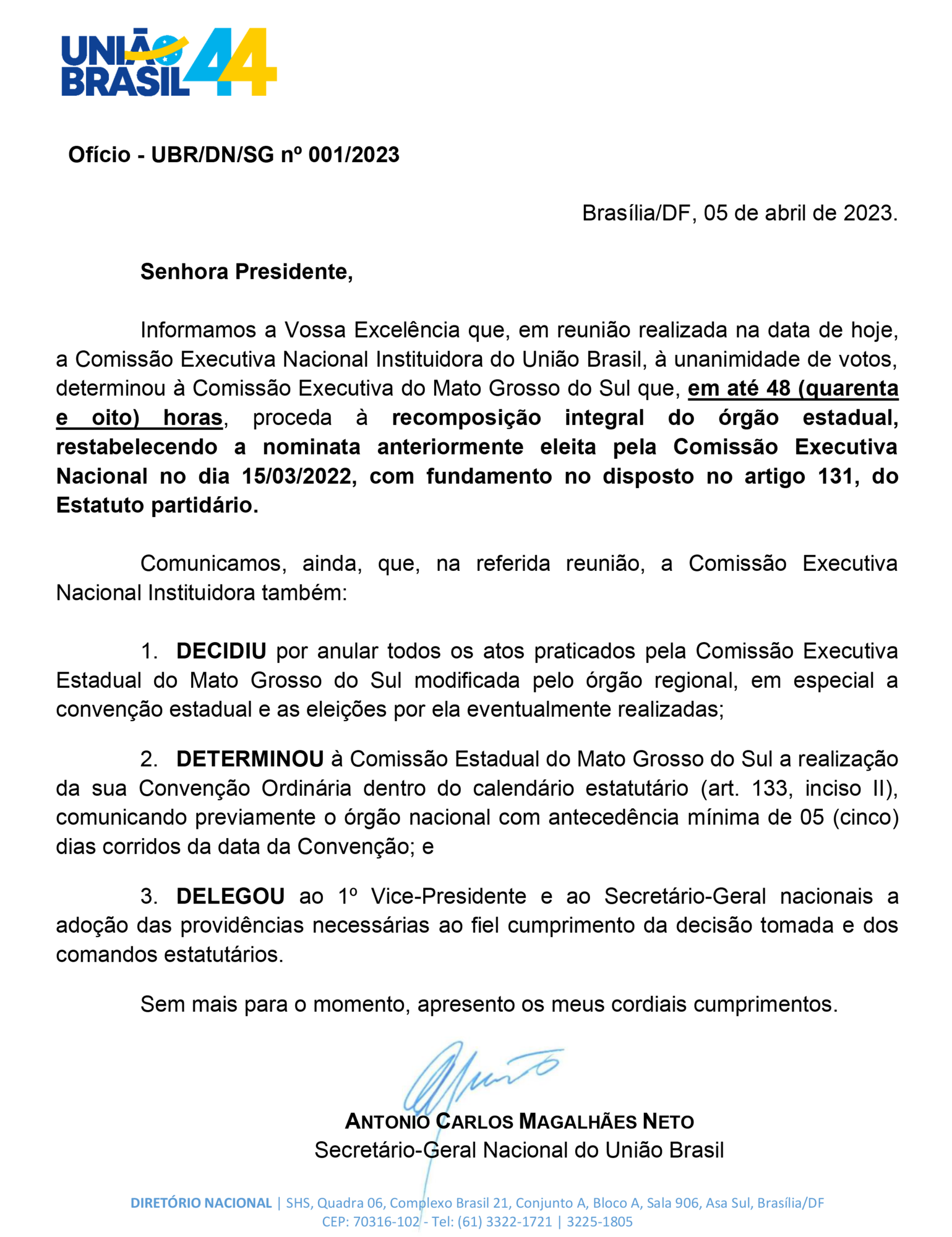 O presidente em exercício do União Brasil, Antonio Carlos Magalhães Neto, determinou nesta quarta-feira (5) que a senadora Soraya Thronicke, presidente da sigla em MS, deve renomear até hoje (sexta-feira, 7/4) a ex-deputada federal Rose Modesto e outros 16 membros retirados da executiva do diretório estadual do partido.