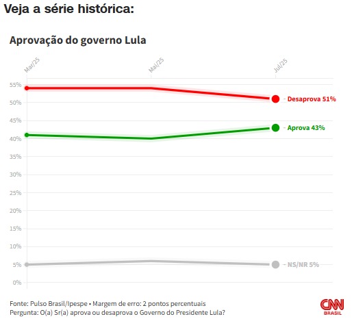 A desaprovação ao governo do presidente Luiz Inácio Lula da Silva (PT) registrou queda de três pontos percentuais em comparação ao último levantamento e agora está em 51%, segundo a pesquisa Pulso Brasil/Ipespe, divulgada nesta quinta-feira (24).