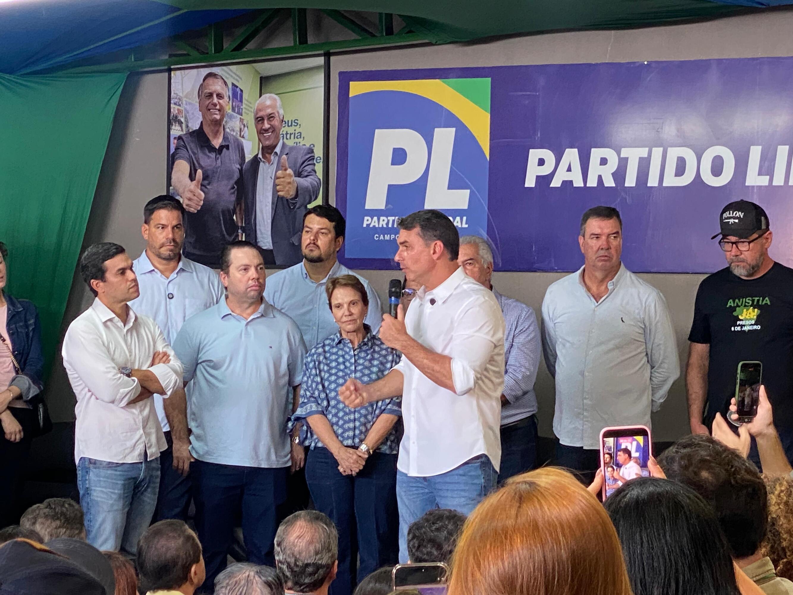 O senador Flávio Bolsonaro participou, nesta sexta-feira (10), de um evento do PL em Campo Grande, reunindo lideranças políticas e aliados do partido em Mato Grosso do Sul. O encontro teve como foco a pré-campanha presidencial e a articulação de alianças para as eleições.