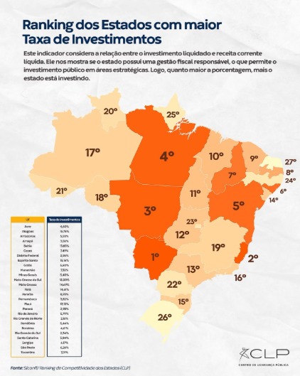 O objetivo é oferecer uma visão abrangente sobre a competitividade dos estados brasileiros. Na classificação geral do indicador de investimento público, Mato Grosso do Sul aparece entre os 10 primeiros, ocupando o 9º lugar.
