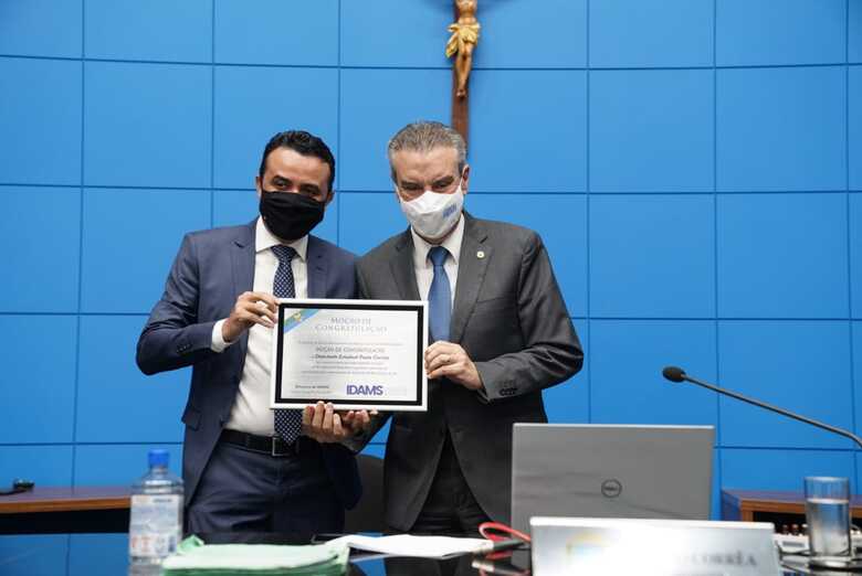 Nesta quinta-feira (6), o deputado estadual Paulo Corrêa (PSDB) foi homenageado em reconhecimento ao trabalho desempenhado como presidente da Assembleia Legislativa de Mato Grosso do Sul (ALEMS) e pelo período à frente do Governo do Estado, durante as férias do governador Reinaldo Azambuja, entre os dias 26 e 30 de janeiro de 2021.