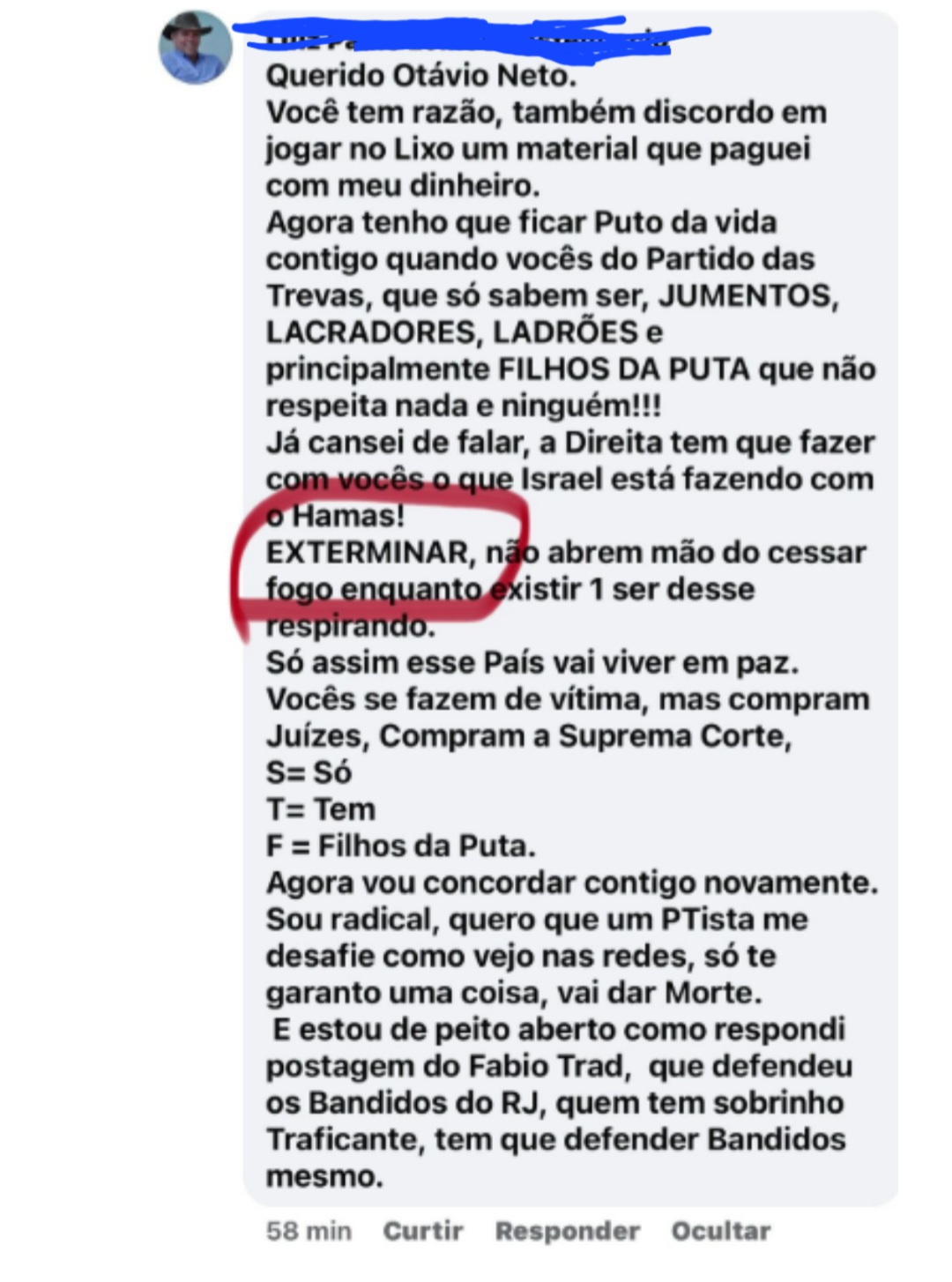 Segundo o documento, a manifestação ocorreu em comentário público no Facebook, com linguagem considerada violenta, hostil e de caráter exterminatório, direcionada a pessoas identificadas por sua orientação política. A peça jurídica afirma que o autor do comentário faz referência a conflitos armados internacionais para justificar a eliminação física de adversários ideológicos, além de registrar ameaça direta ao afirmar que “vai dar morte” a quem o desafiar.