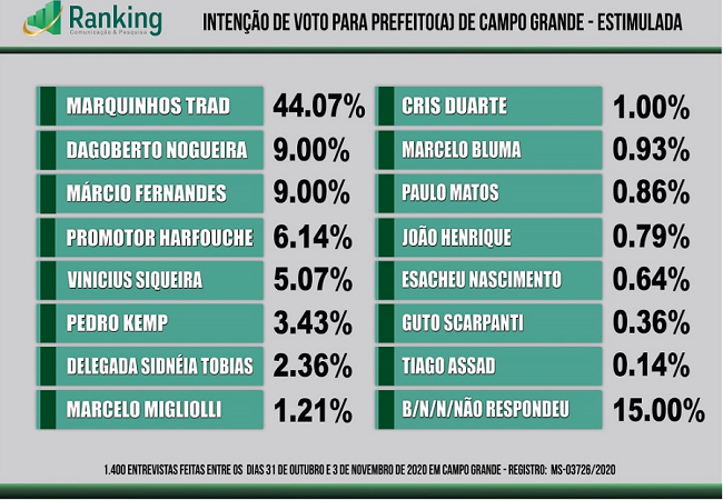 O Instituto Ranking divulgou nesta quarta-feira (4) mais uma pesquisa eleitoral realizada na Capital. O atual prefeito e candidato à reeleição Marquinhos Trad aparece em primeiro, com 44,07% as intenções de votos.