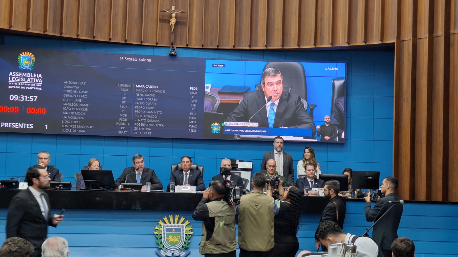 O governador de Mato Grosso do Sul, Eduardo Riedel (PP), participou nesta terça-feira (3) da Sessão Solene de Instalação dos Trabalhos Legislativos de 2026, realizada na Assembleia Legislativa de Mato Grosso do Sul (Alems). Na ocasião, o chefe do Executivo estadual destacou as prioridades do governo, a harmonia entre os Poderes e a importância do diálogo democrático com a sociedade.