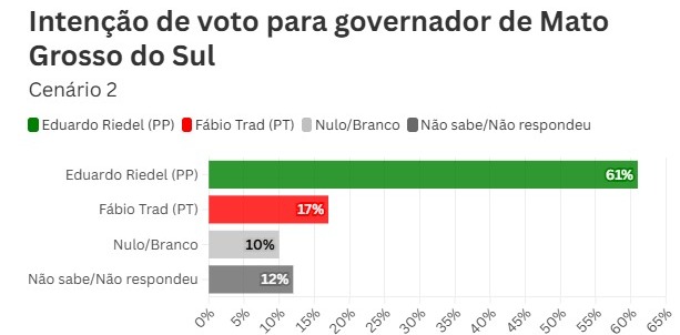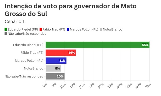 No primeiro cenário testado, Riedel surge com 55% das intenções de voto. Em segundo lugar aparece o ex-deputado federal Fábio Trad (PT), com 16%, seguido pelo deputado federal Marcos Pollon (PL), que marca 11%.