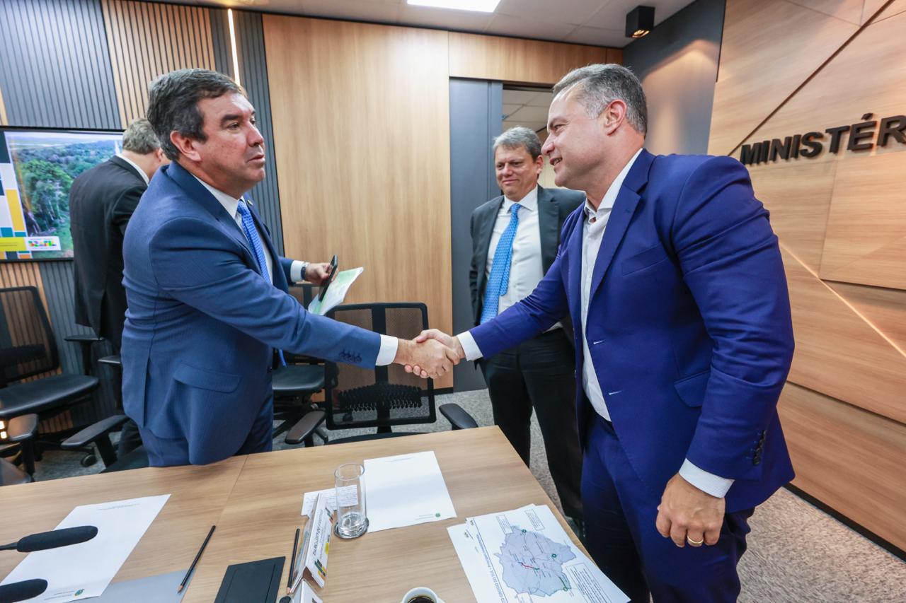 Governador de Mato Grosso do Sul, Eduardo Riedel, governador de São Paulo, Tarcísio Freitas, e o ministro dos Transportes, Renan Filho (Foto: Reprodução/Assessoria Ministério dos Transportes)