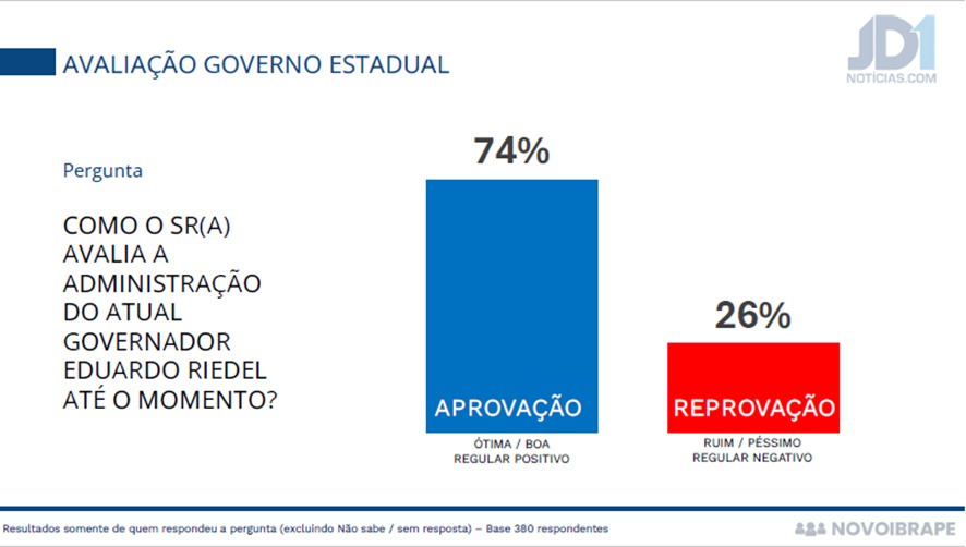 Segundo a pesquisa, 74% da população corumbaense aprova a gestão do governador, sendo que 11% classifica como ótima, 36% como boa e 27% regular positiva. Riedel tem apenas 26% de reprovação na Cidade Branca.