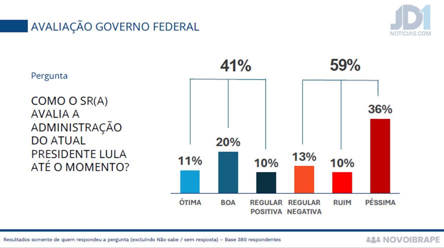 Já o presidente Lula tem a maior porcentagem negativa, onde 59% reprovam a administração, classificando como ruim/péssimo. De aprovação, o número fica em 41%, sendo 11% ótima, 20% boa e 10% regular negativa.