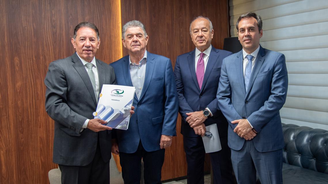 A entrega simbólica do parecer foi feita ao presidente da ALEMS, deputado estadual Gerson Claro, durante visita institucional que contou com a presença do diretor jurídico do TCE-MS, Luiz Henrique Volpe Camargo, e do chefe de gabinete da presidência, Ricardo Koim.