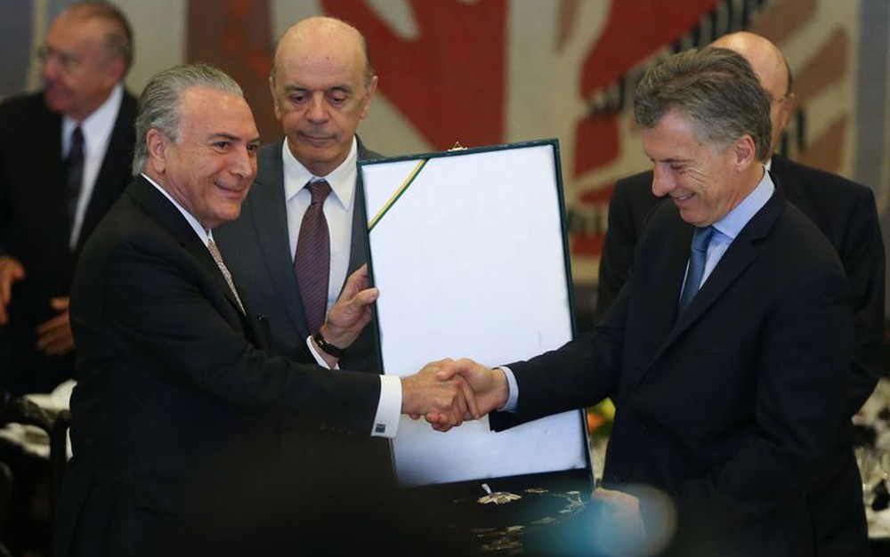 O presidente Michel Temer cumprimenta o presidente argentino, Mauricio Macri, durante almoço no Palácio do Itamaraty (Antonio Cruz/Agência Brasil)