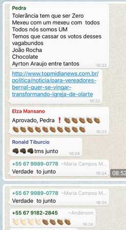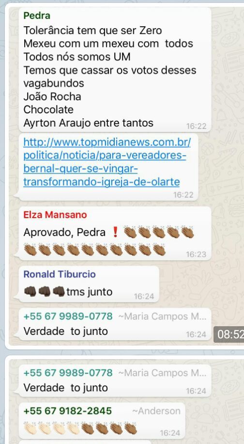 O vereador cassado e ex-secretário de governo Paulo Pedra xingou o presidente da Câmara Municipal vereador João Rocha de “vagabundo” em uma conversa de whatsapp em um grupo. No grupo Pedra postou uma notícia relacionada ao ex-prefeito Gilmar Olarte e incitou: “Tolerância tem que ser zero, mexeu com um mexeu com todos. Nós somos um temos que cassar os votos desses vagabundos. João Rocha, Chocolate, Ayrton Araújo entre tantos”. Pessoas com nome de Elza Manzano, Ronald Tiburcio e Maria Campos apoiaram as ofensas proferidas. O grupo se chama “Guerreiros do Bernal”, e pelo jeito, Pedra deixou alguém descontente, já que a informação vazou.