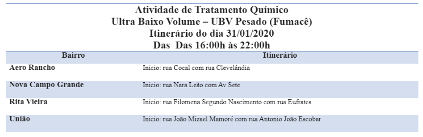 Os bairros Aero Rancho, Nova Campo Grande, Rita Vieira e União vão receber nesta sexta-feira (31) o serviço de borrifação Ultra Baixo Volume (UBV), também conhecido como fumacê.