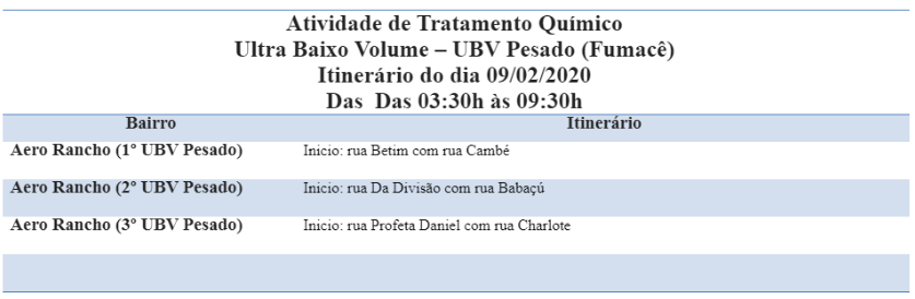 Os veÃculos de borrifação irão transitar pelo bairro das 3h30 à s 9h30 (Reprodução/Assessoria)O Bairro Aero Rancho receberá três equipes do serviço de borrifação Ultra Baixo Volume (UVB), Fumacê, neste domingo (9), para reforçar o combate ao mosquito Aedes aegypti, transmissor da dengue, zika e chikungunya.